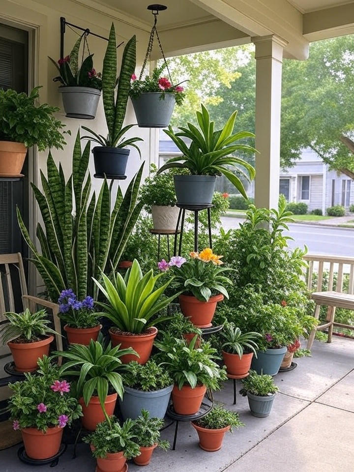 A couple of well-placed potted plants can work wonders for your home entrance. Choose low-maintenance options like snake plants, ferns, or succulents. If you have a covered porch, consider hanging planters or tiered plant stands to add dimension.