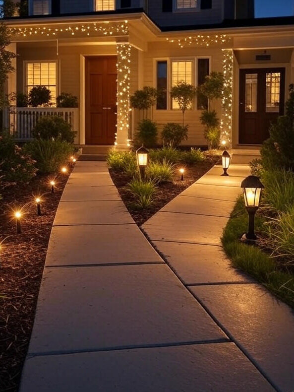 Try flanking your door with matching sconces or placing pathway lights to create a warm, inviting glow at night. These options are energy-efficient and usually easy to install, even for beginners.