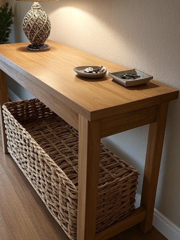 If your entryway allows for it, a slim console table or a narrow bench can be both functional and decorative. Add a few baskets for storage, a table lamp for ambiance, and a dish or tray for keys and mail.