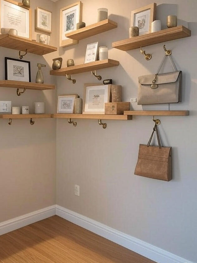 Floating shelves are perfect for small entrance areas that don’t have room for furniture. Use them to display decor items like candles, vases, or small artwork. You can also add hooks underneath for keys, hats, or bags.
